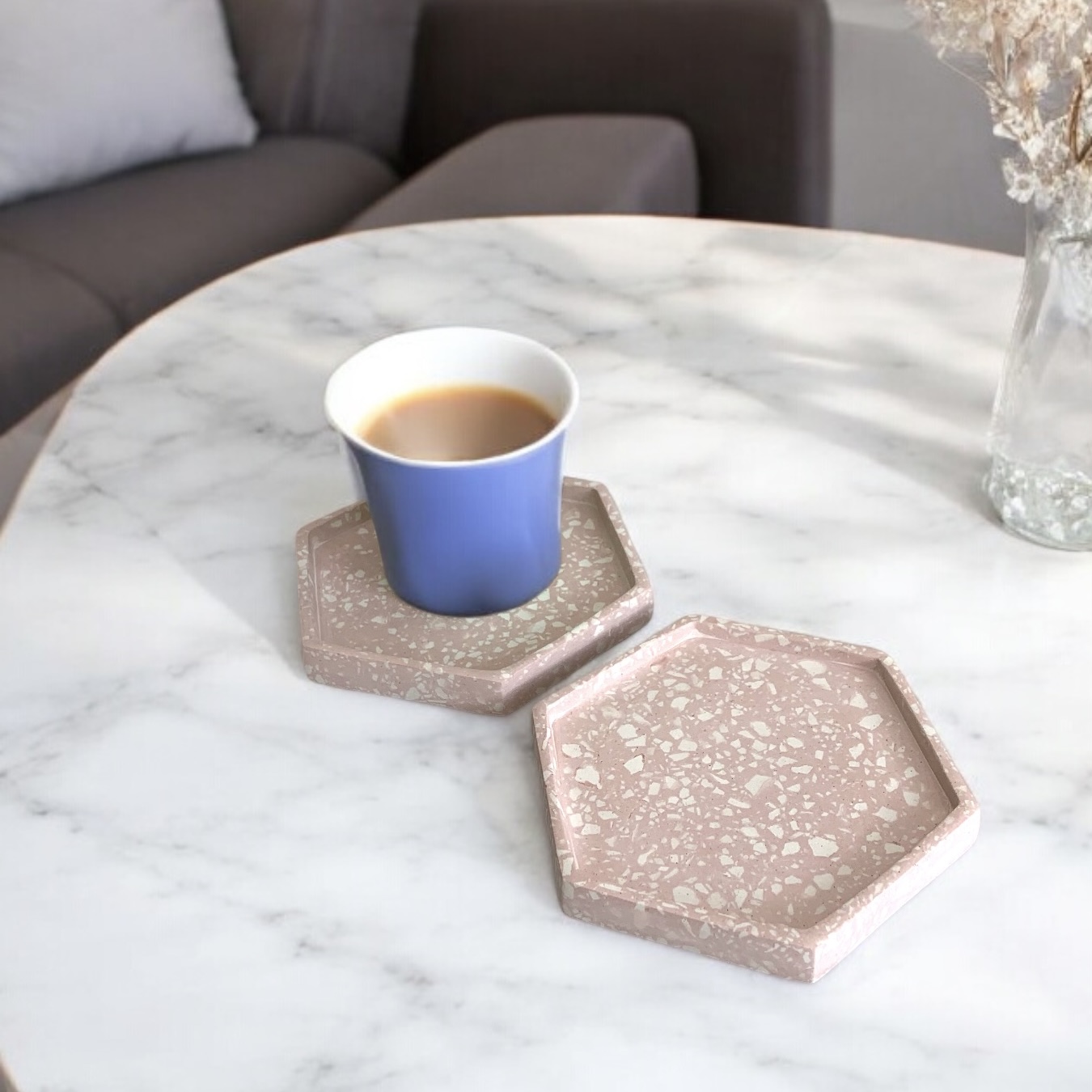 Lengkapi keindahan ruanganmu dengan Terrazzo coaster hexagonal ini. Hadir dalam bentuk geometri segi enam yang trendy, coaster ini menampilkan motif terrazzo aksen warna biru muda minimalis.